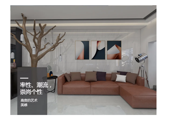 600x1200MM本身的尺寸和纹理效果是它最大的优势之一,用最简单的直铺贴方式,反而最能展示出600x1200MM纹理大气美观的效果,大面积铺贴,使空间更显大气开阔。